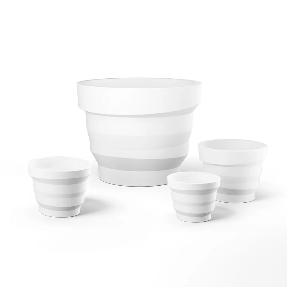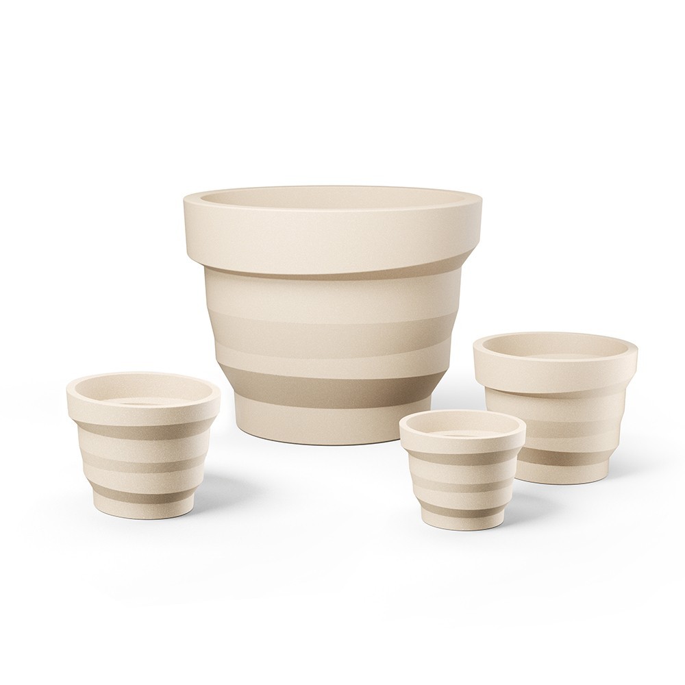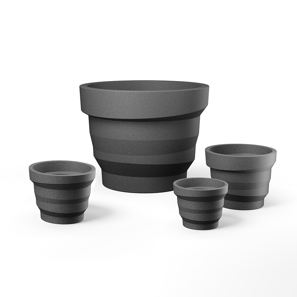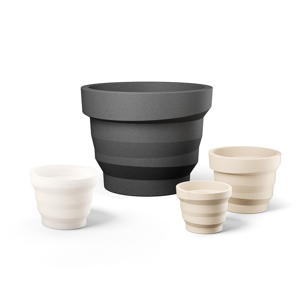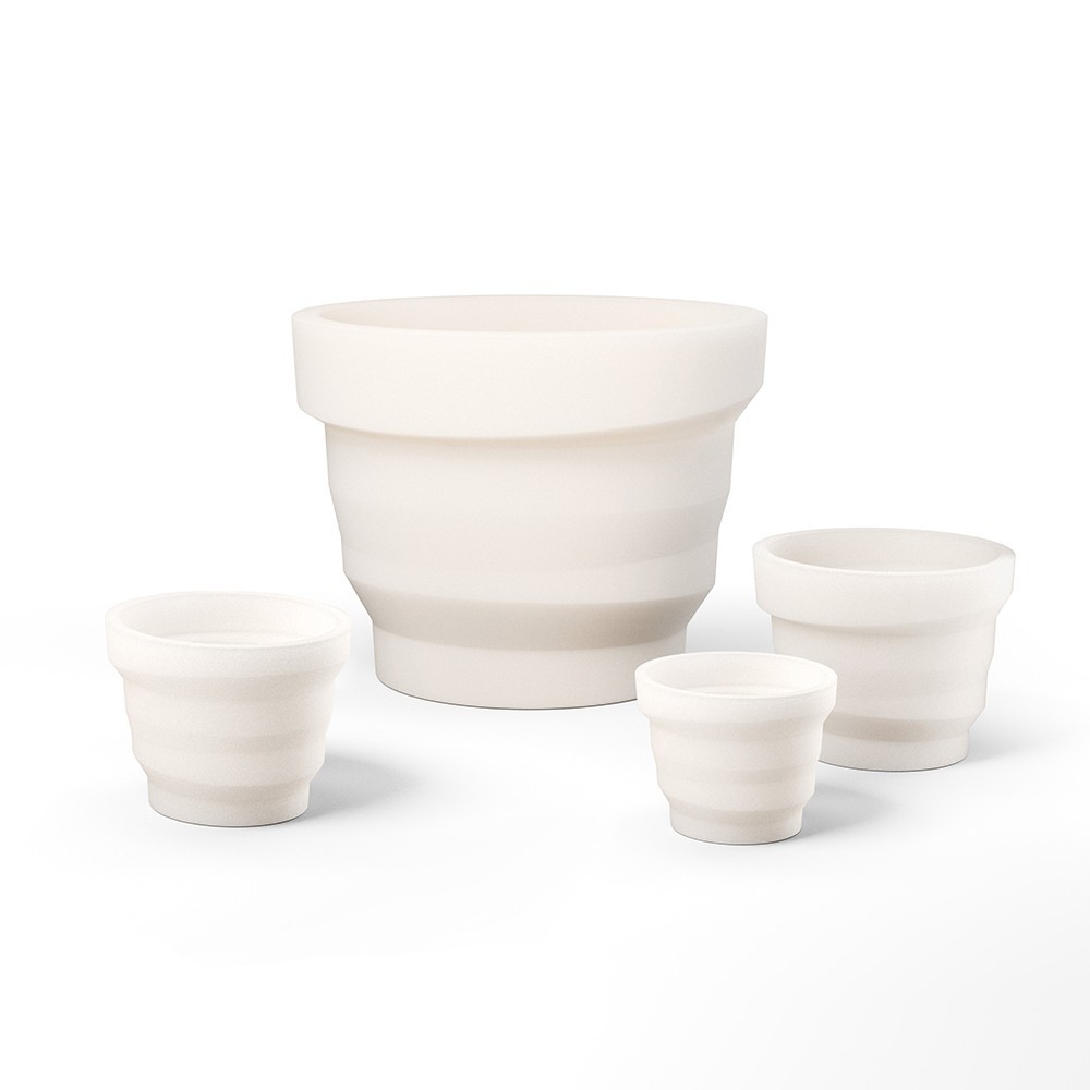 Nel dialetto milanese, “rebelot” significa “caos” ed è proprio l’apparente caotico cambio di piani che caratterizza la forma. La disponibilità in 5 formati diversi, lo rendono ideale per piante o decorazioni vegetali di diverse dimensioni e nella versione maxi si rende particolarmente adatto ad hall di ambienti collettivi o spazi aperti. In versione luminosa i piani spezzati contribuiscono a creare dei forti contrasti di luce ed ombra per una luce d’atmosfera dinamica e coinvolgente.
